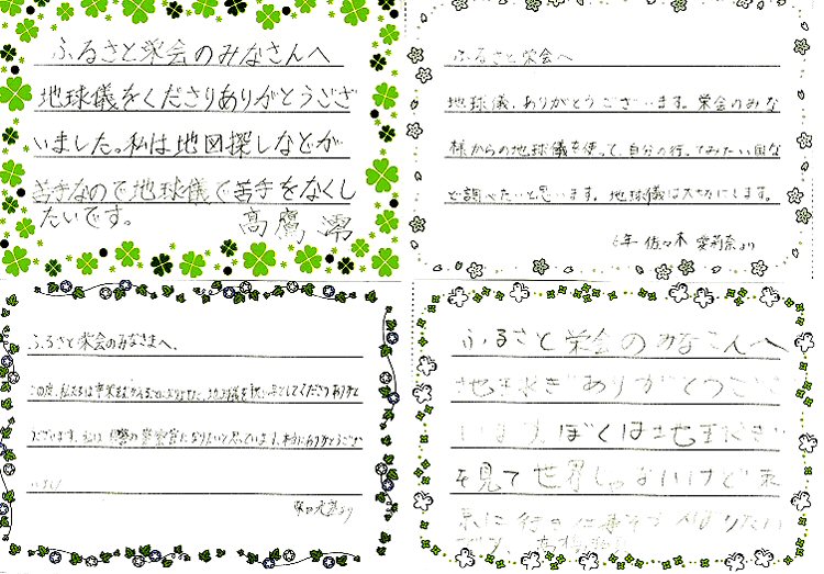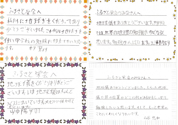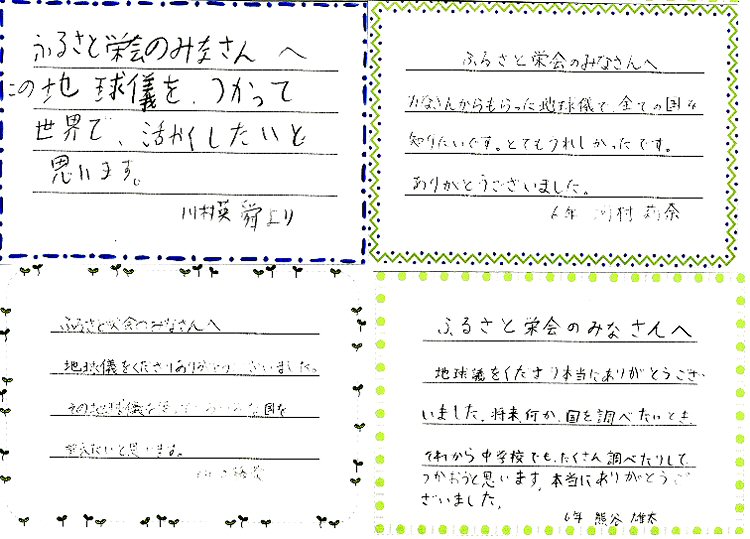 ふるさと栄会様 いつも大変お世話なっております。 さて3月14日の卒業記念品贈呈式の際に、6年生に地球儀を贈呈しました。6年生は教室で地球儀を手にとり、とても喜んでいました。地球儀を贈っていただき心より感謝申し上げます。 つきましては、6年生のメッセージのデーターと写真をお送りいたします。ご覧いただければ,ありがたいです。
